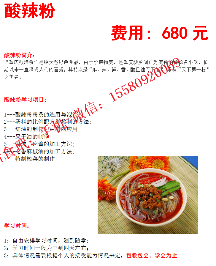 重庆酸辣粉费用为600元,(费用包含技术培训费、三年内技术、免费指导开店等所有费用,中途不增收任何费用。)