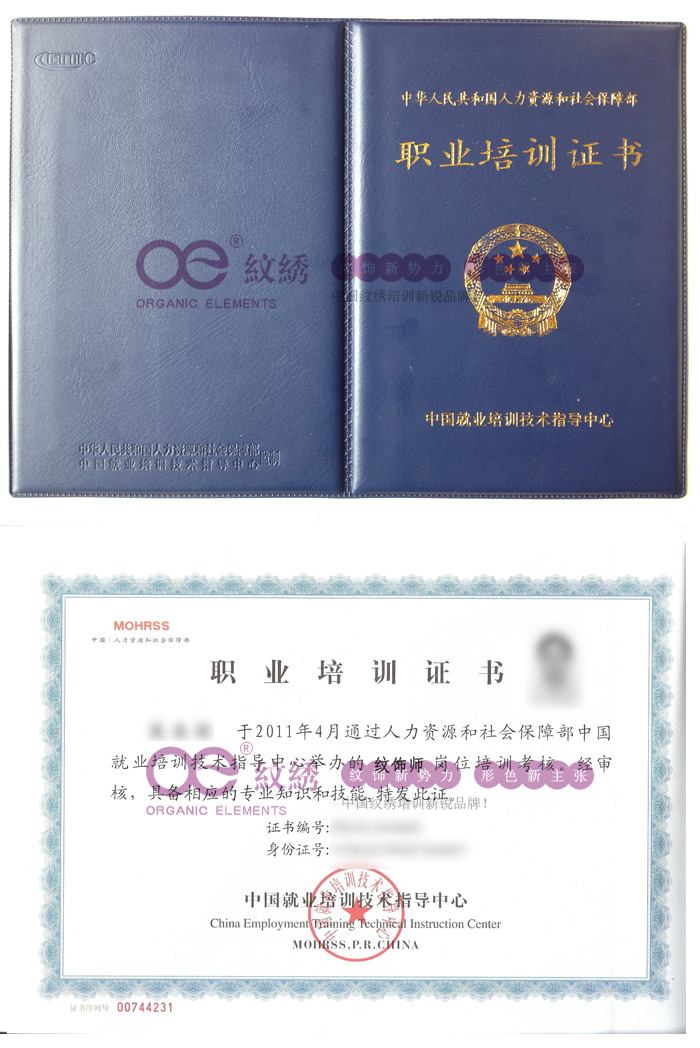 六、考取纹饰师证书:中国人力资源和社会保障部权威认证颁发 1、提升纹绣师个人专业形象;2、增加找工作面试筹码;3、加强个人信心,塑造职业形象