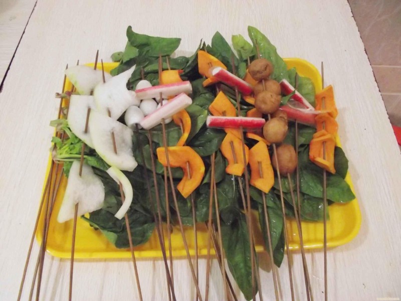 2、将食材用竹签串制好摆放整齐,提供锅具等,顾客选择后自己将菜品放入锅中烫制,适合店面经营