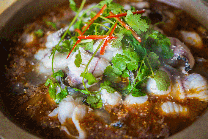 石锅鱼,采用十几种天然中药材,精心熬制红油。再用活鱼现杀,切成大薄片,入石锅里烹煮,汤底“鲜美清甜”,鱼片“鲜嫩细腻”,是湘菜中的一道名菜。