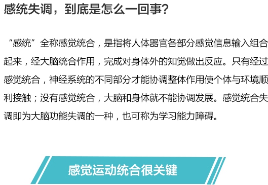 感觉统合训练的关键是同时给予儿童前庭、肌肉、关节、皮肤触摸、视、听、嗅等多种刺激,并将这些刺激与运动相结合。 感觉统合训练涉及心理、大脑和躯体三者之间的相互关系,而不只是一种生理上的功能训练,儿童在训练过程中获得熟练的感觉,增强自信心和自我控制的能力,并在指导下感觉到自己对躯体的控制,由原来焦虑的情绪变为愉快,在积极积累经验的基础上,敢于对意志想象进行挑战。 感觉统合训练就是要用耐心培养孩子的兴趣,建立孩子的自信心;要让孩子在游戏中感到快乐,自动自发才有效;感觉统合训练因人而异,让孩子每天都有多样的感觉刺激。