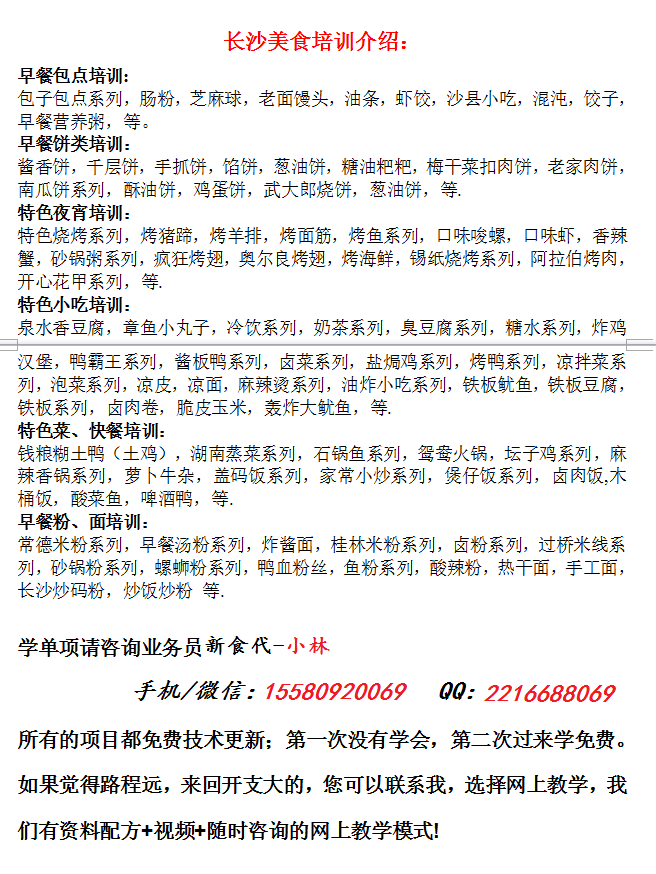 1、长沙早餐系列培训:(包子、饺子、土家饼、酱香饼、馅饼、营养砂锅粥、桂林卤粉)等