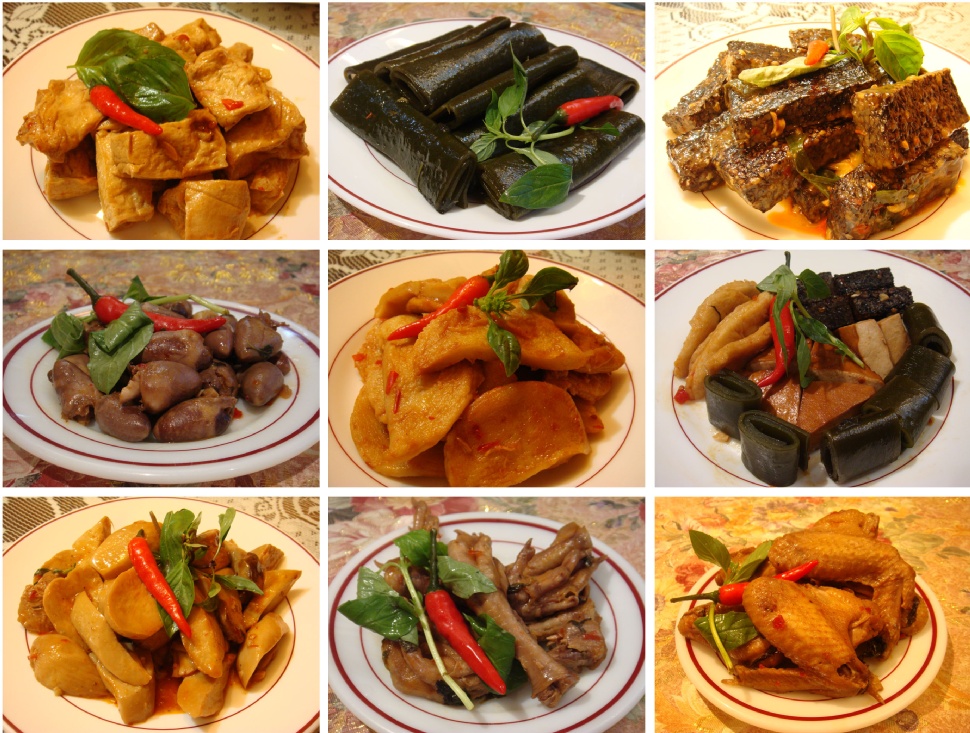 豆制品类:五香面筋、香卤干子、卤水素鸡、五香腐竹、香卤千张等。