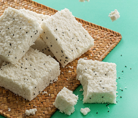 10. 抖动勺子将米粉撒在模具上,铺满一层。