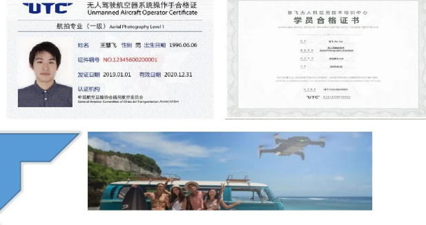 课程颁发由中国航空运输协会通用委员会认证的《UTC无人驾驶航空器系统操作手合格证》+慧飞颁发的《慧飞无人机应用技术培训中心学员合格证书》