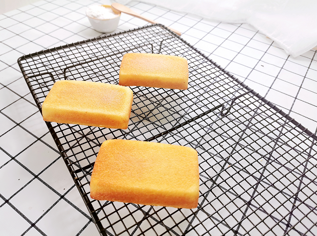 9号,出炉后,将模具抬起轻轻摇晃,然后将模具倒置冷却,冷却后取出蛋糕,放在干燥网上彻底冷却。