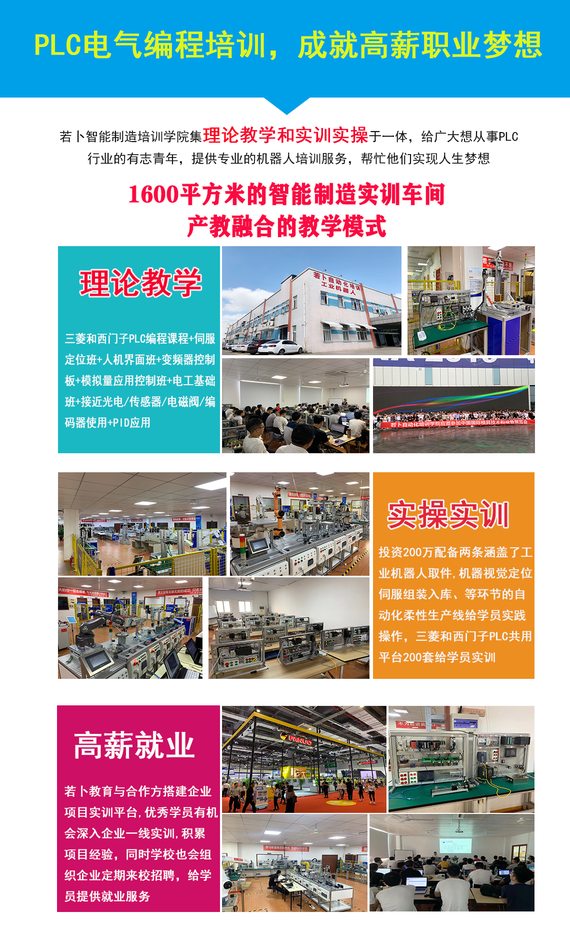 2021年元旦投资2000万的若卜智能制造学院新实训基地落成,面积达到6000平方米,拥有100个免费车位,全职教职员工达到60人,拥有自己的自动化设备生产公司,真正做到产教研融合,成为华东智能制造人才培训领军品牌