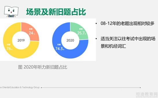 新旧题的对比:去年新题占四分之三,旧题占四分之一。这个比例没有太大的变化,可以适当关注以往考试当中出现过的场景词汇,来查漏补缺。但是不要过于依赖以往考过的题目。