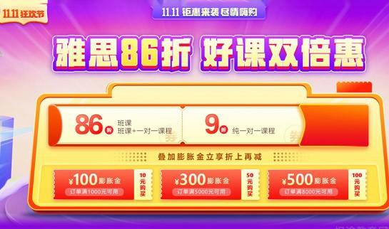 大连新东方英语双十一课程优惠价格,雅思课程86折,还有好课双倍惠,我们的优惠分成了86折的班课和一对一课程,还有9折的纯一对一课程,另外我们的优惠还设置了叠加膨胀金立享折上再减的活动。