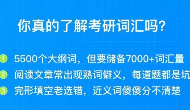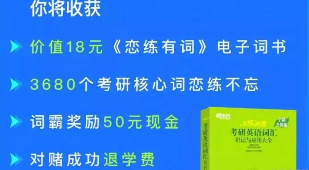 5500个大纲词,但要储备7000+词汇量;阅读文章常出现熟词僻义,每道题都是坑;完形填空老选错,近义词傻傻分不清楚;加入恋练有词对赌营,30天牢记考研核心词,坚持学习并通过测试,学费全退还有丰厚背词奖励等你来拿!