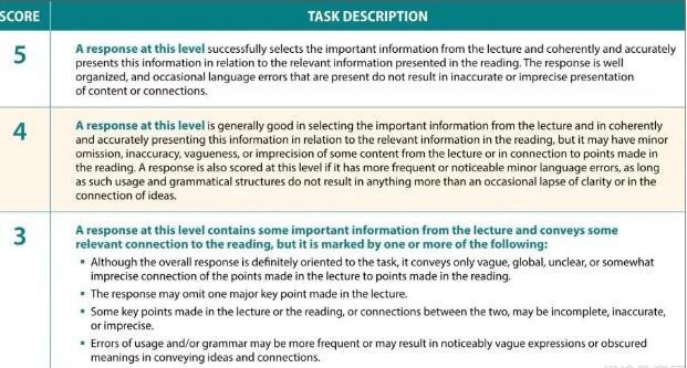 写作评分标准是什么?在所有的写作题型中,写作标准其实是一致的。下面贵阳新东方就拿五分写作评分标准,给大家举个例子:A response at this level successfully selects the important information from the lecture and coherently and accurately presents this information in relation to the relevant information presented in the reading. The response is well organized and occasional language errors that are present do not result in inaccurate or imprecise presentation of content or connections.