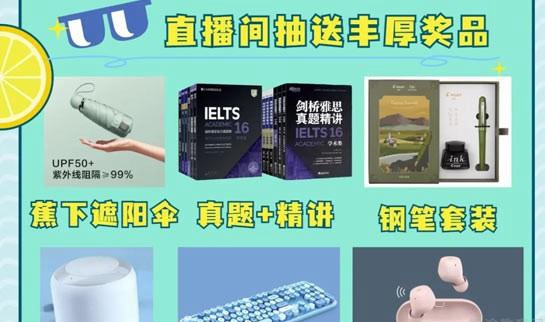 杭州新东方雅思为学员们准备的直播间礼盒有遮阳伞,还有雅思真经等一系列教材以及备考习题,还有钢笔套装和音响以及耳机等等,都是我们备考雅思的年轻学生们会比较喜欢的东西!7月4日机构就会清凉开播,这次直播课程主题很精彩,学员们能收获超多东西!