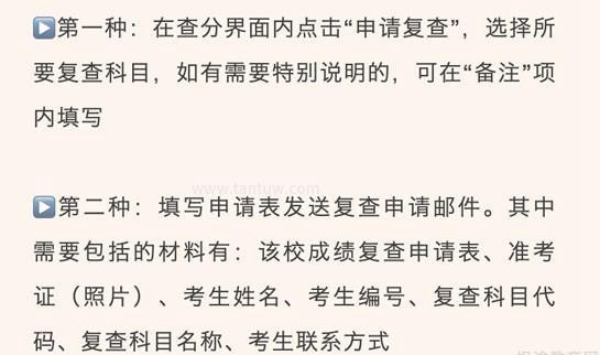 第二种:填写申请表发送复查申请邮件。其中需要包括的材料有:该校成绩复查申请表、准考证(照片)、考生姓名、考生编号、复查科目代码、复查科目名称、考生联系方式具体是哪种复查申请方式,大家要看目标院校官网通知。