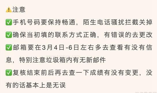 在3月4日-6日左右要多查看有无信息,特别留意垃圾箱内的新邮件,复核结果出来前后再看看成绩有没有变化,如果没有变化,基本上就是无误的。