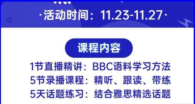 5节录播课——11月23日~11月27日,每天解锁一节录播课,带你用具体BBC素材做精听&跟读练习。